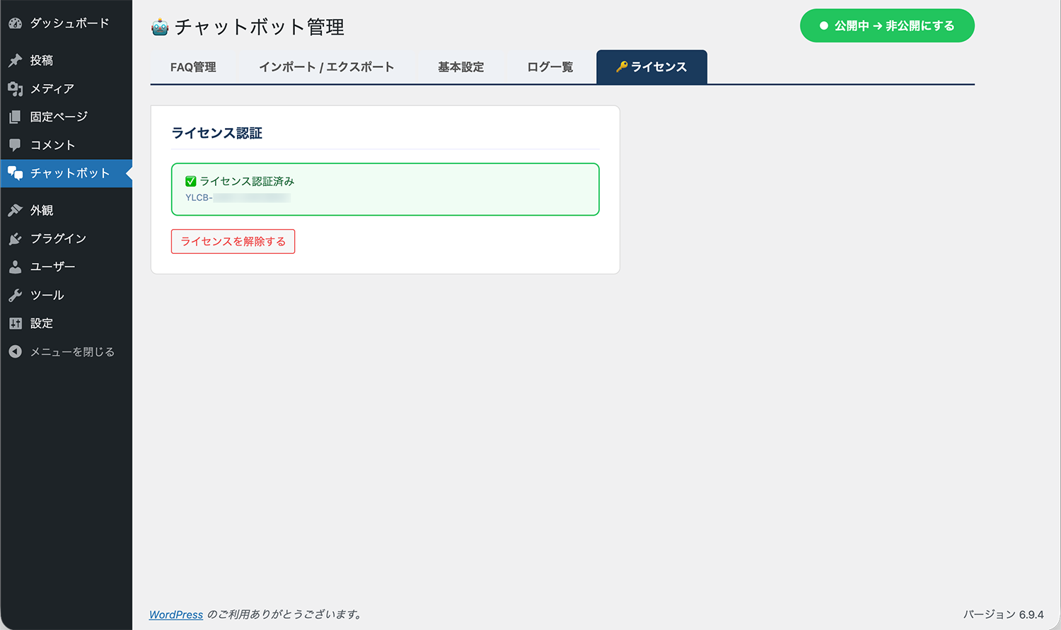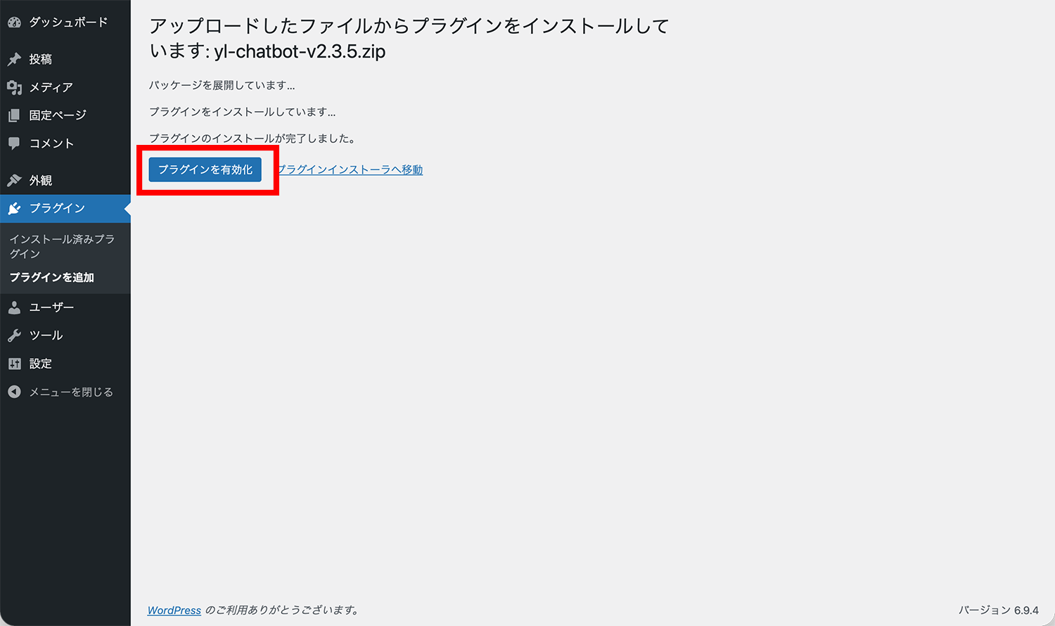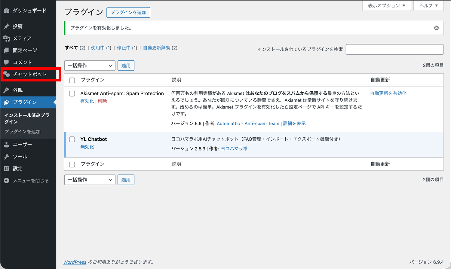 インストール完了後、「プラグインを有効化」をクリックします。有効化が完了すると、左メニューに「チャットボット」という項目が追加されます。