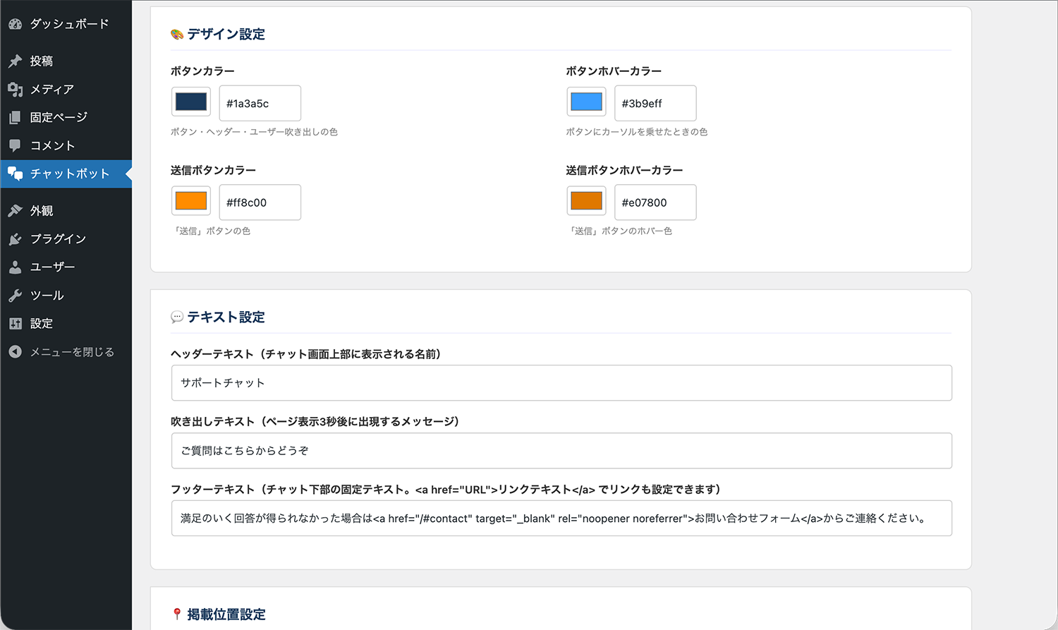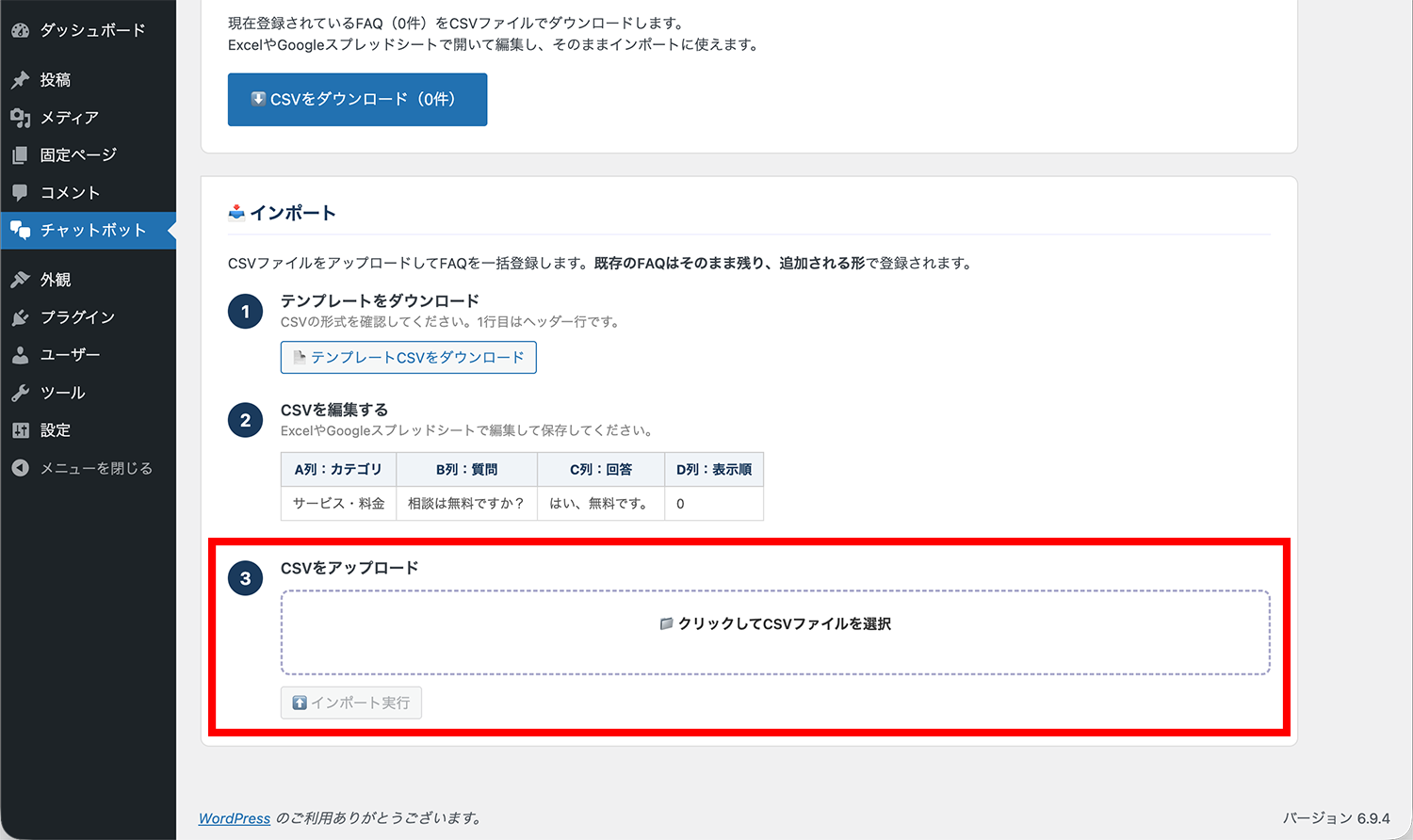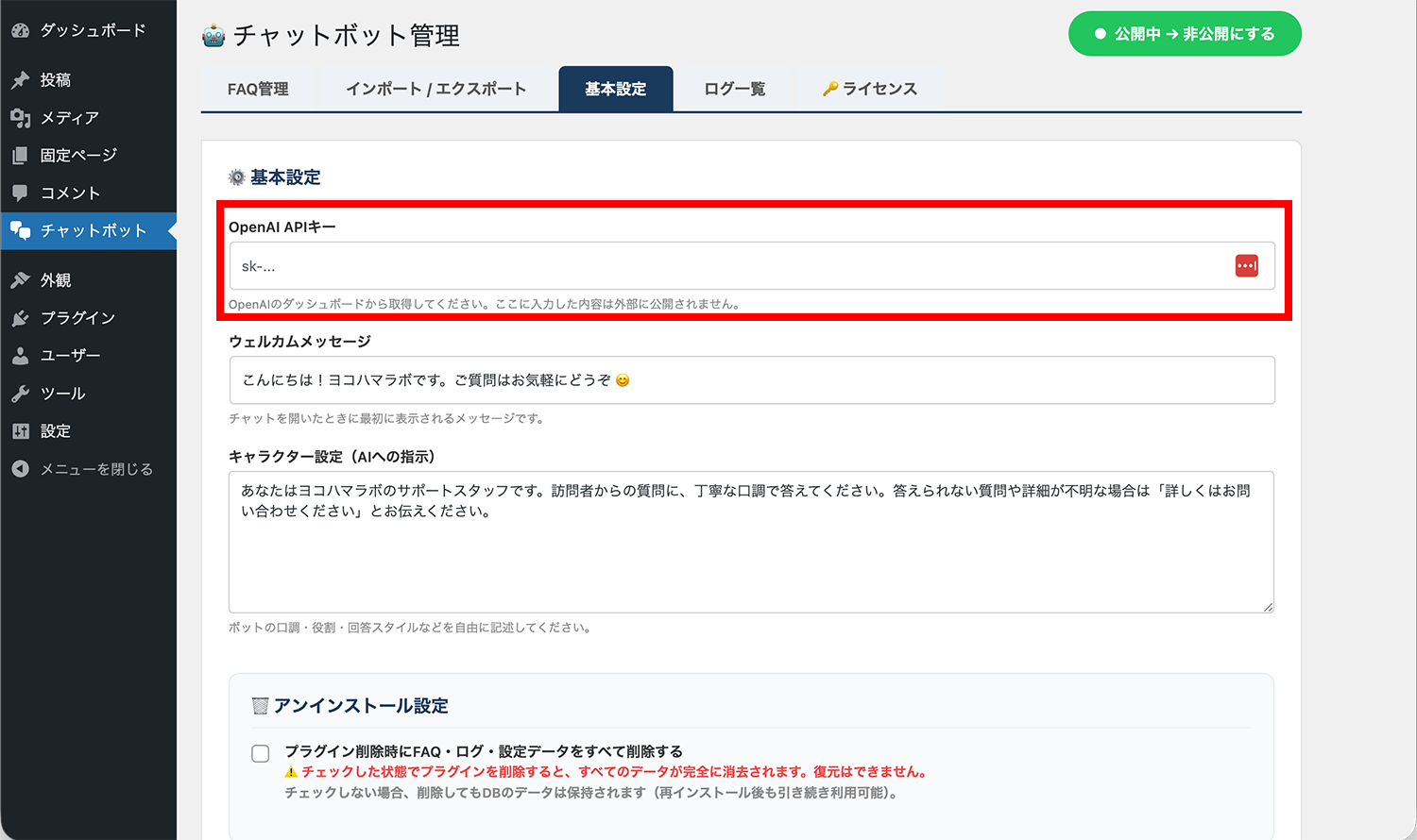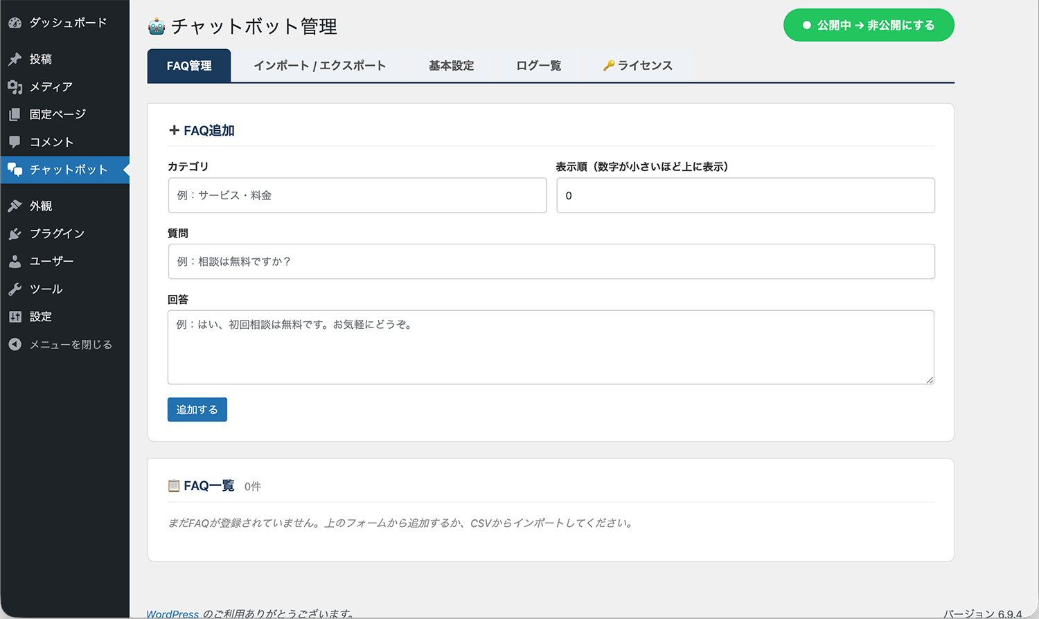 インストール完了後、「プラグインを有効化」をクリックします。有効化が完了すると、左メニューに「チャットボット」という項目が追加されます。